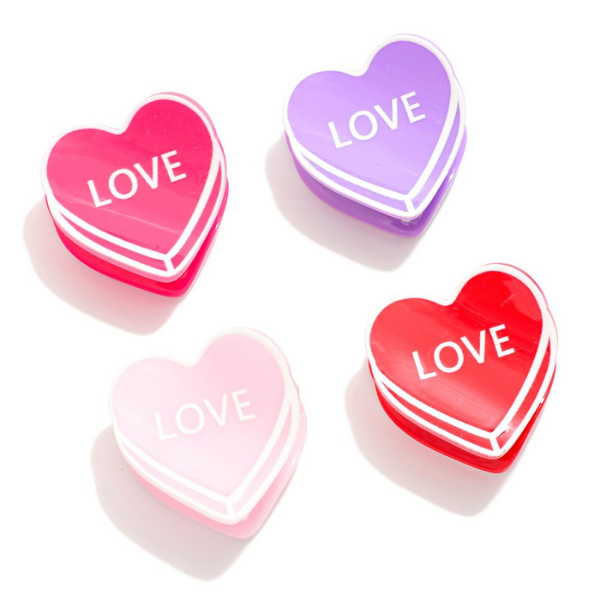 Spread the love with our adorable 4pc Candy Hearts Claw Clip Set! These charming clips feature sweet pastel designs perfect for Valentine's Day and beyond. Each clip delivers a secure, all-day hold that keeps your hair exactly where you want it—no slipping or sliding. Whether you're styling half-ups, securing ponytails, or creating playful updos, these fun accessories combine cuteness with serious staying power. Treat yourself or gift them to someone special this season.
