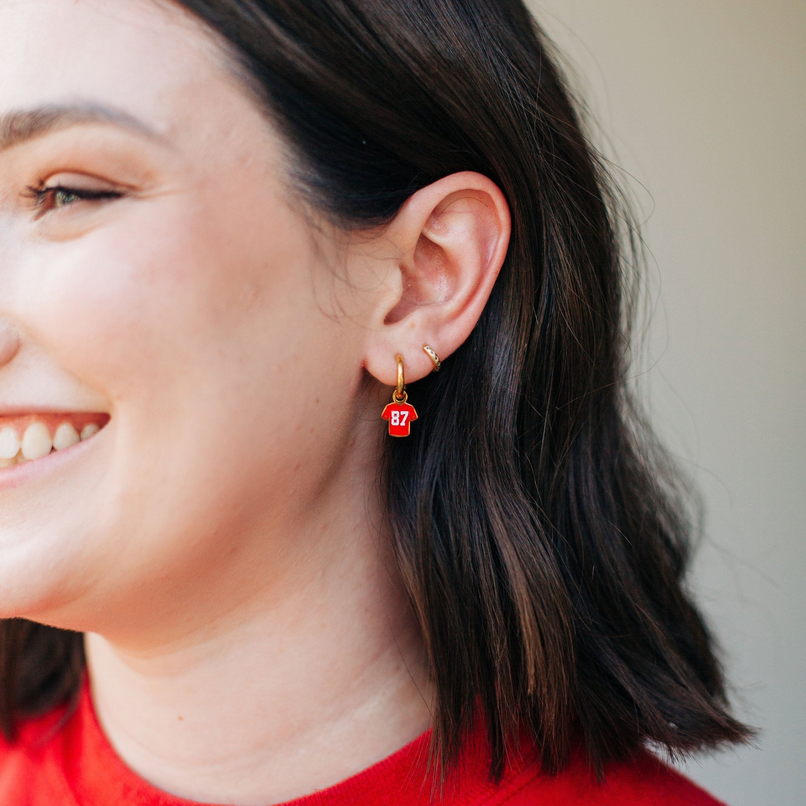 Score a touchdown with these Kansas City Chiefs #87 Tight End Jersey Huggie Hoop Earrings! Fun and simple, they're the perfect addition to your game day outfit. Plus they were worn by Mama Kelce!