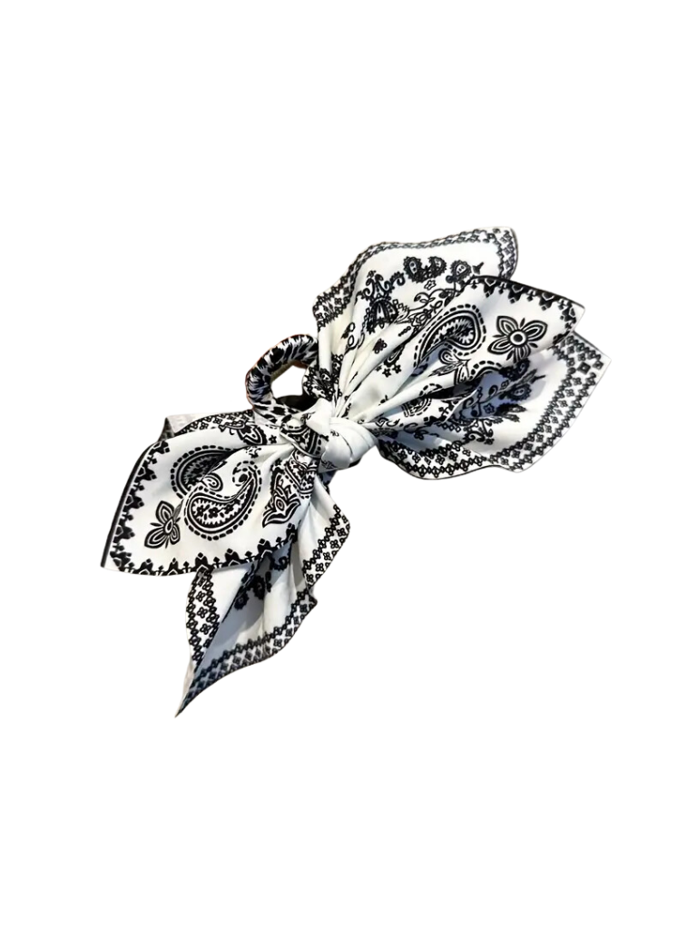 Add a playful touch to your hairstyle with this Black & White Paisley Bow Claw Clip. Featuring a charming bow design and a timeless paisley print, it offers a secure hold that keeps your hair neat all day. Perfect for adding both style and function to any look, this claw clip blends cute flair with reliable grip.