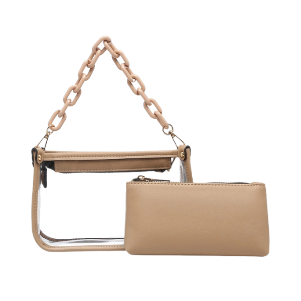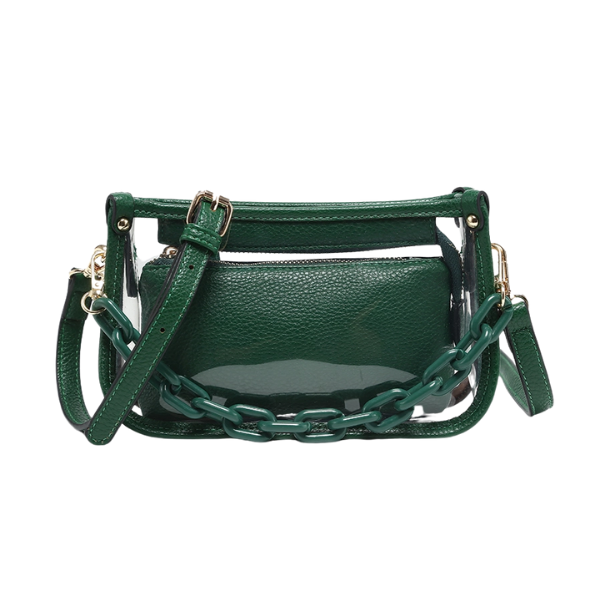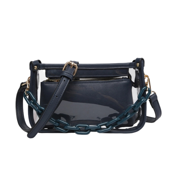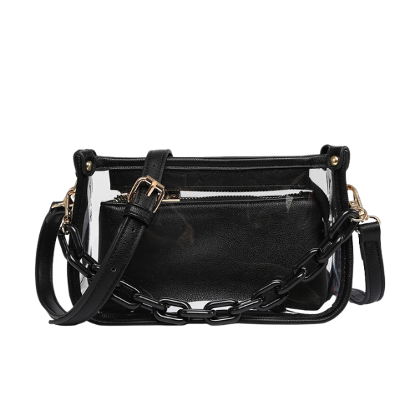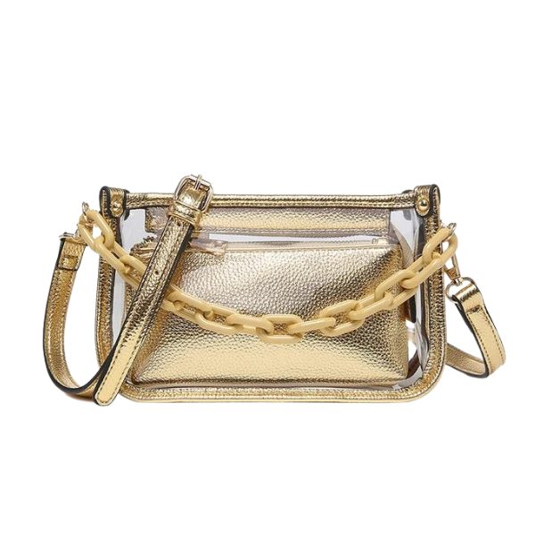 Stay stylish while adhering to stadium regulations with our Clear Crossbody Bag! Perfect for game days, this versatile bag features a unique "bag in a bag" design and a convenient chain shoulder strap. Look good and follow the rules - it's a win-win!