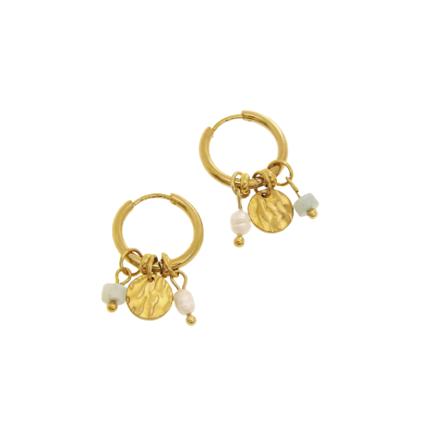 Gold Disc & Two Bead Charm Clicker Hoop Earrings
