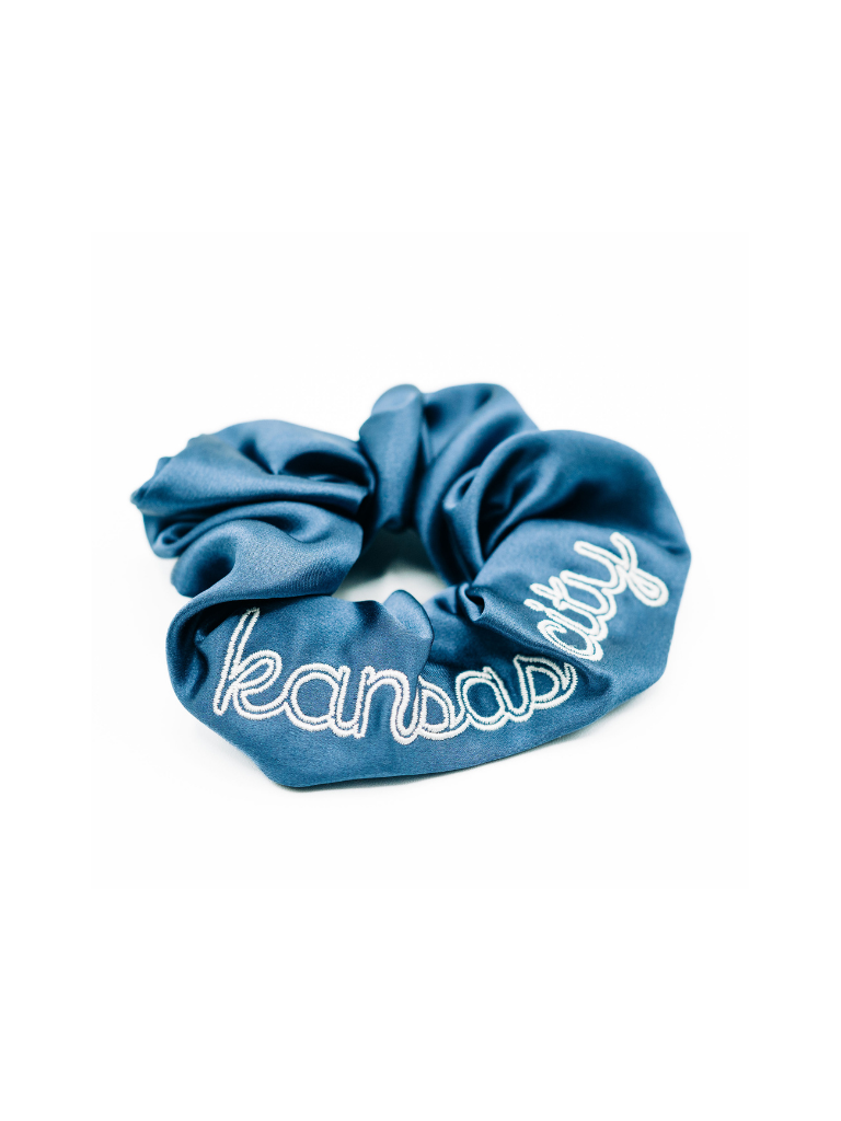 Introducing our Kansas City Dark Blue Embroidered Scrunchie, the perfect accessory for everyday wear or a fun addition to your gameday look! Hand embroidered for a unique touch, this scrunchie is both cute and functional. Don't miss out on this playful hair accessory.