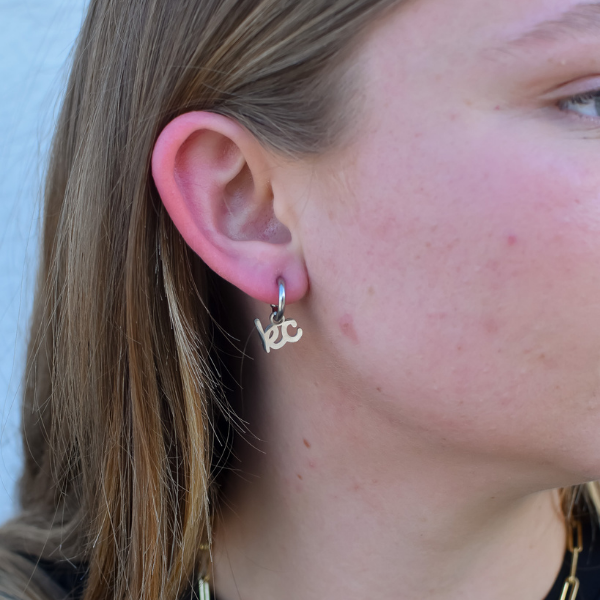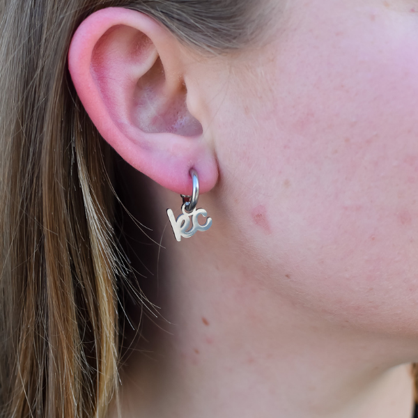 Spread love and show your KC pride with these cute and simple Silver Script Charm Huggie Hoop Earrings. Perfect for a fun and quirky look, these earrings are a must-have for any Kansas City fan!