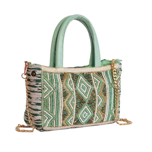 Multi-Pattern Green Beaded Mini Tote Bag