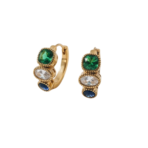 Make a statement with these dazzling multicolor gem hoops that bring instant sparkle to any look. Each earring features a trio of vibrant gemstones that catch the light beautifully, creating a playful pop of color that works for both everyday wear and special occasions. The fun, eye-catching design lets your personality shine through while the classic hoop silhouette keeps things timeless. Perfect for anyone who loves a touch of glamour with a whimsical twist.
