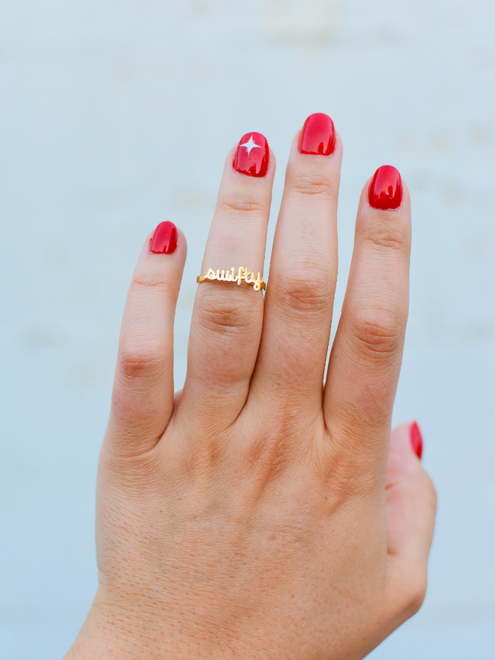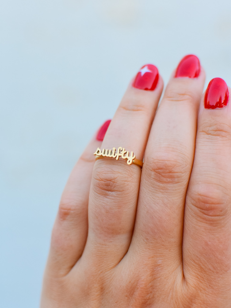 Get ready to show off your love for Taylor Swift with the Swifty Script Ring. This cute and fun accessory is perfect for all you "Swifties" out there. Wear it with pride and join the Taylor Swift fandom (without taking yourself too seriously)!