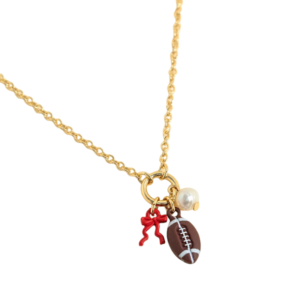 Celebrate your love for the game with this charming 'Touchdown' Football & Red Bow Charms Slider Necklace. Featuring a playful football charm paired with a vibrant red bow, this necklace adds a fun and cute touch to any outfit. Its slider design allows for easy adjustment, ensuring a perfect fit every time. Perfect for sports fans who want to show their spirit with style and personality.